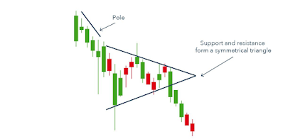 To identify a bearish pennant, look for a consolidation between support and resistance after a major bearish price move (the pole). The support and resistance lines will form a roughly symmetrical triangle, showing that the market is in conflict between positive and negative sentiment.